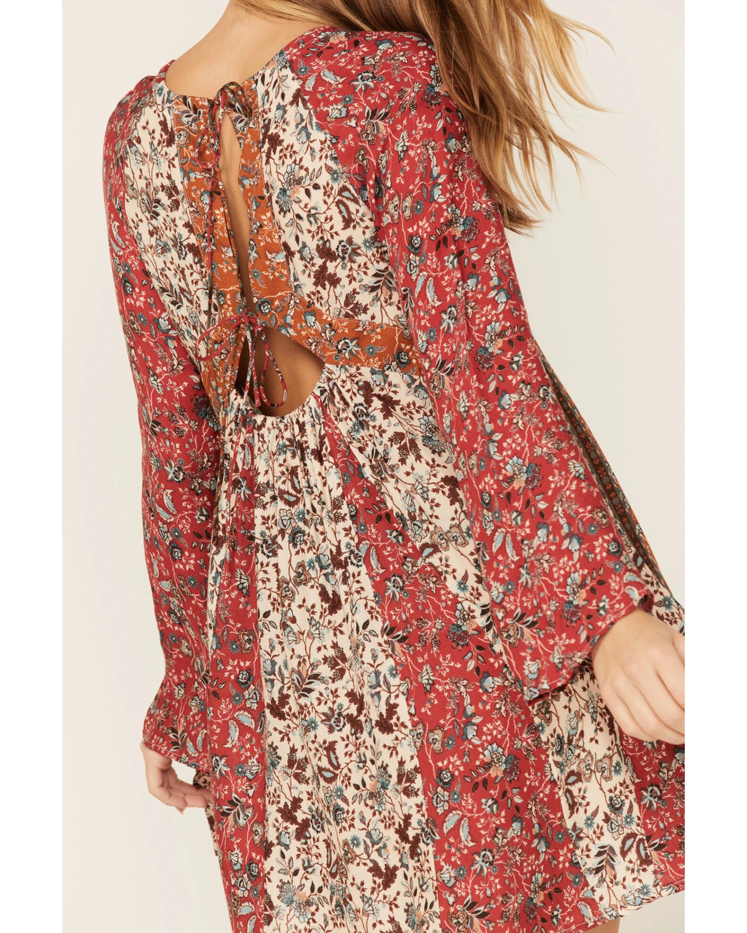 Lovestitch Women’s Red & Natural Bell Sleeve Tie Back Mini Dress