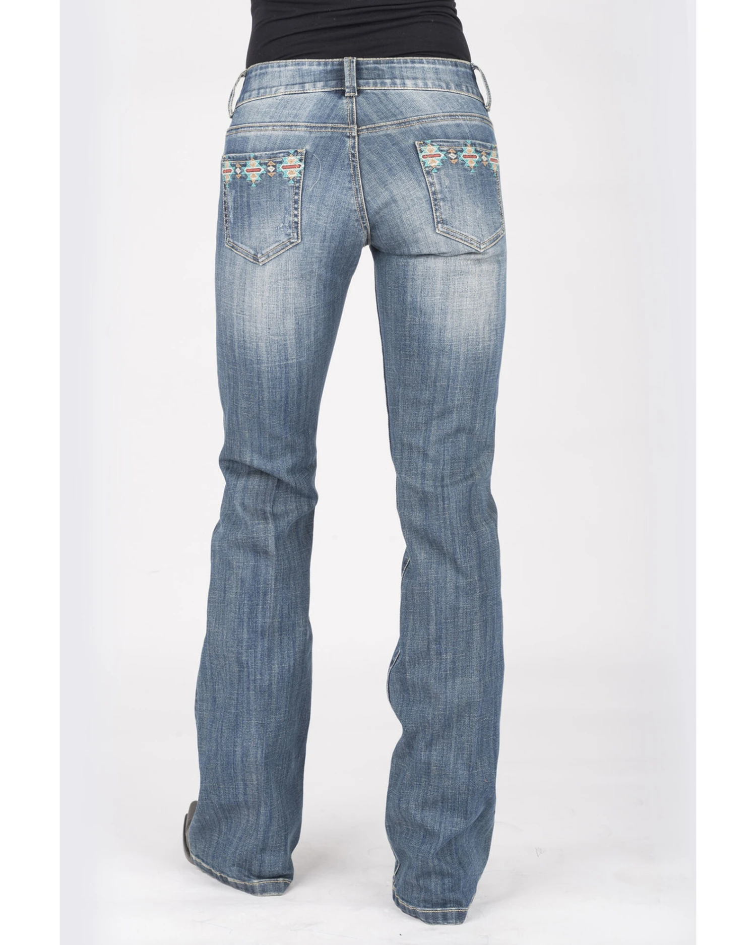- Southwestern embroidery along back pockets